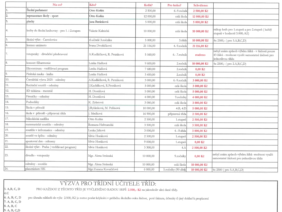 SCHVÁLENÉ PŘÍSPĚVKY PRO ŠKOLNÍ ROK 2024/2025